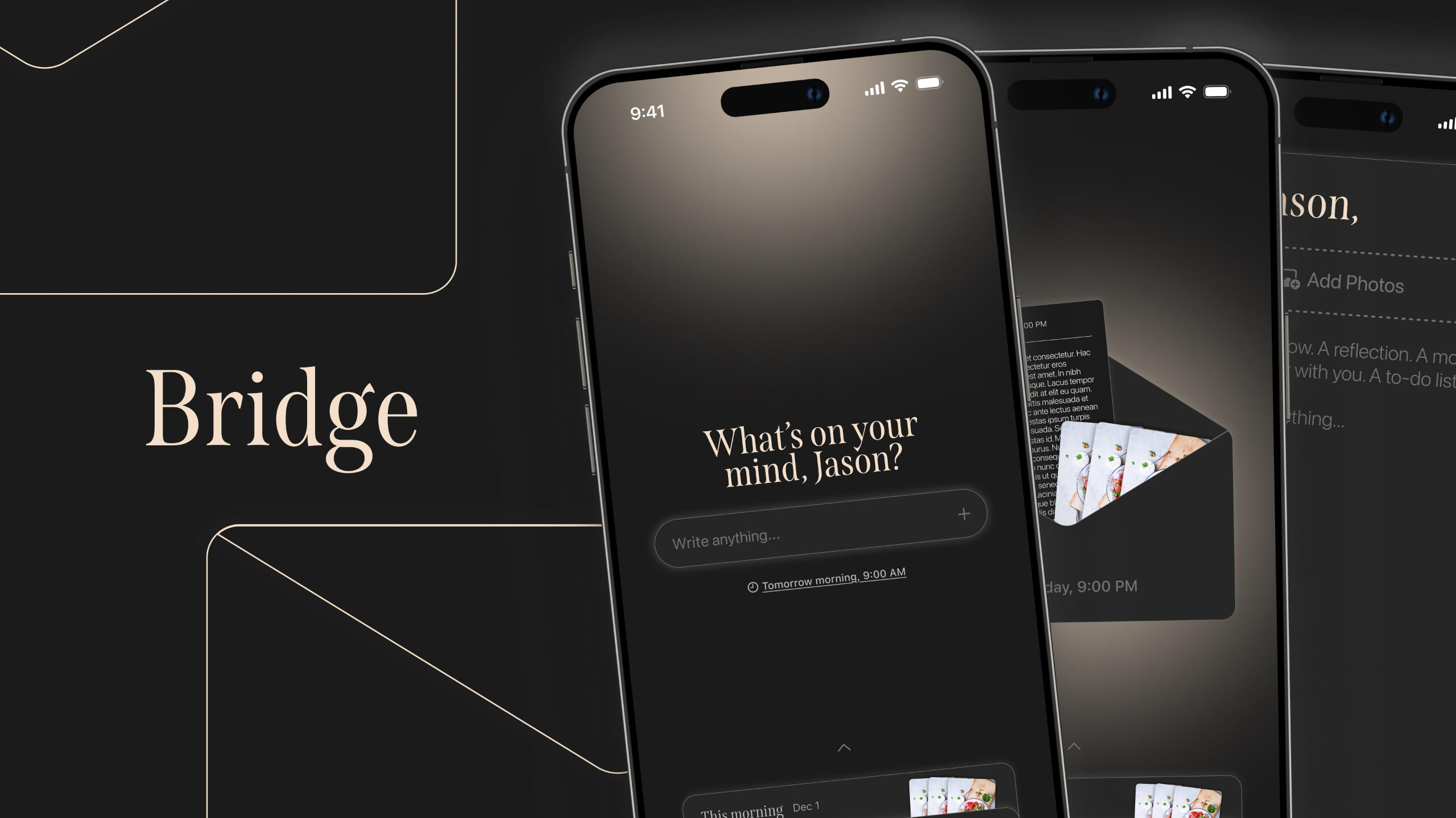 A mindfulness and journaling ritual that connects who you are today with who you’re becoming. Each night, write a letter to your tomorrow—filled with reflections, lessons, and intentions. When morning comes, start with clarity and purpose.Sign up for early access to Bridge here.